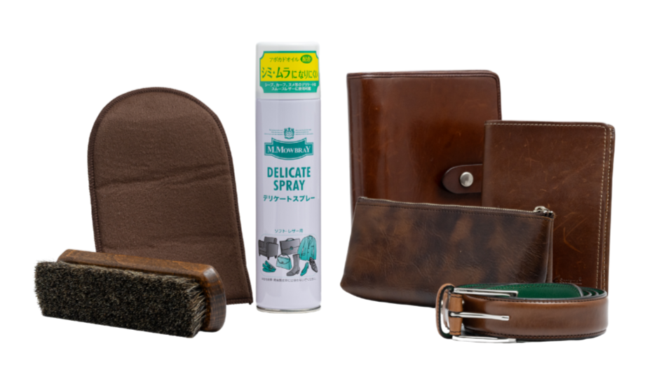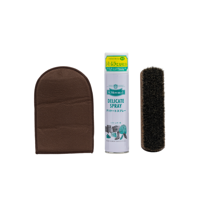 革に潤いを与える保湿スプレー、ホコリ落とし用ブラシ、仕上げ用クロスをまとめてセットにしました。
